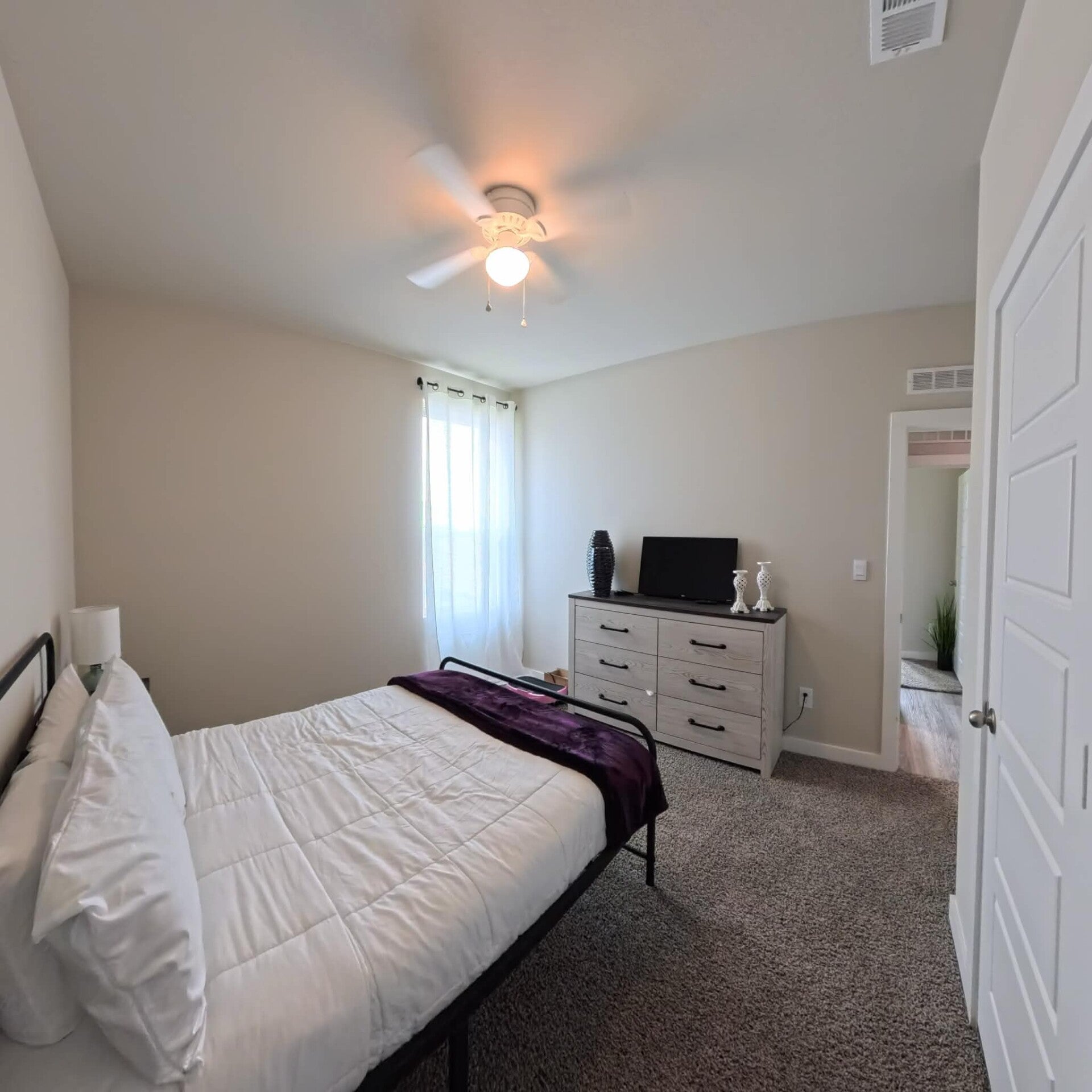 The first thing you’ll notice is the feeling of softness underfoot. The neutral, plush carpeting provides a quiet, cozy foundation that complements any decor style. As the sun streams through the windows, the room is filled with vibrant natural light, making the space feel even larger and more inviting.